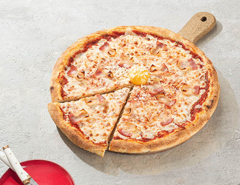 Нежный бекон с сыром моцарелла на томатном соусе с добавлением яичного желтка (30 см).